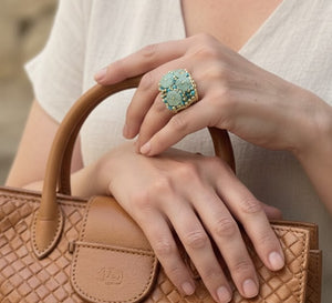 Un tocco di luce e colore per impreziosire il tuo stile! Questo anello, con i suoi fiori di avventurina incastonati tra brillanti turchesi, è un gioiello che non passa inosservato. Un capolavoro di artigianato, perfetto per ogni occasione