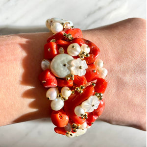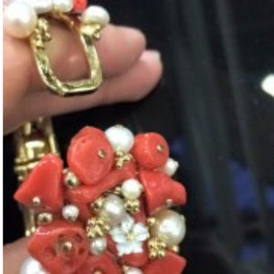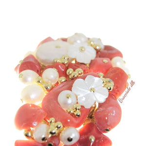 ✓Qualità tecniche✓ Tipo di materiale naturale: vero corallo e fiori di conchiglia, perle d’acqua dolce, essendo non trattati, possono presentare delle sfumature di colore leggermente diverse da quelle presentate nella foto da considerarsi un pregio ed un elemento di unicità assoluta.Forme artigianale bracciale a scatto 20cm circa, montatura argento 925.