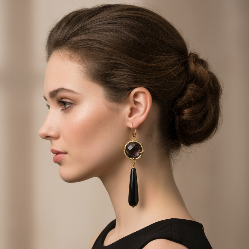 ✓Qualità tecniche✓ Tipo di materiale naturale: quarzo fumè,goccia onice materiali naturali con colori che possono cambiare dalla foto. Altezza orecchino quasi 40mm circa, peso 8 gr circa.