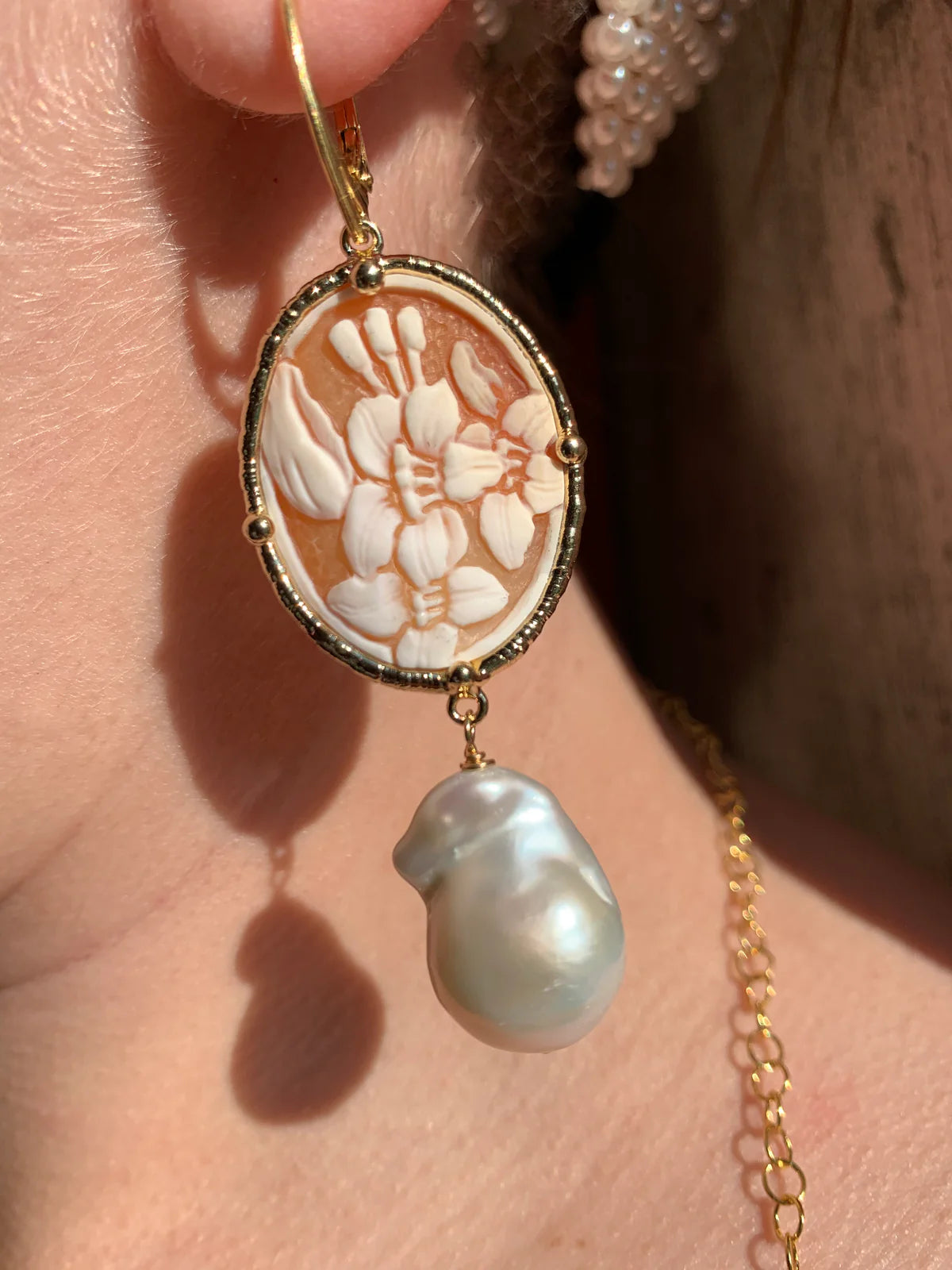 ✓Unicità✓ Orecchini donna, unici e irripetibili incisioni realizzate a mano con materiali di prima qualità come il cammeo di conchiglia e perle barocche, gli orecchini sakura, rappresentano la bellezza dei fiori.Lo stile è studiato con passione per trasmettere unicità per chi lo indossa.